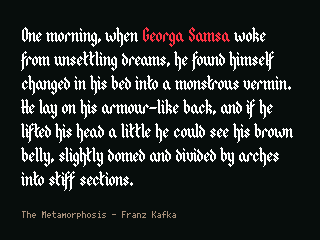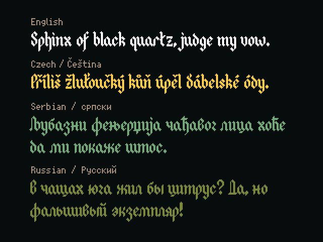 Great font. I have discussed with gleeson the possibility of adding Czech language support and as soon as this will come, I will be printing with it calendar as a christmass present for friends. :) Also looking into possibility of using it for my play.date game - so super excited :)