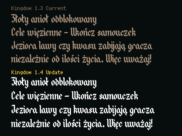 Here is an example showing the current (1.3) and upcoming (1.4). The new update improves kerning and glyphs in some areas, coming in a few days.
